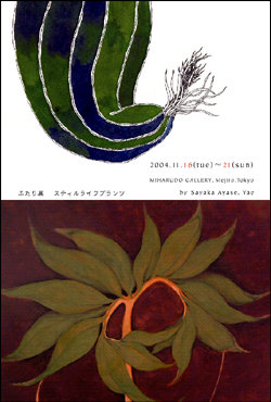 子供の頃を思い出すと必ず浮かぶ風景のひとつがコタツとハハで コタツの上にも横にもクレパスやら紙やら綺麗な粉の入った壜が散らばり 子供はおとなしくハハの向かいにもぐりこみ 時々、色とりどりのおもちゃに手を触れたり、青色の指に話しかけてみたり とても冬らしい冬を過ごしていたように思います 母と娘の絵を並べたら面白いかも、という冗談のような思いつき 11月の散歩、静物のような生物のような植物 冬眠する前に少し、奇妙な空間を作ってみました あやせ ayase-illustration * close * |